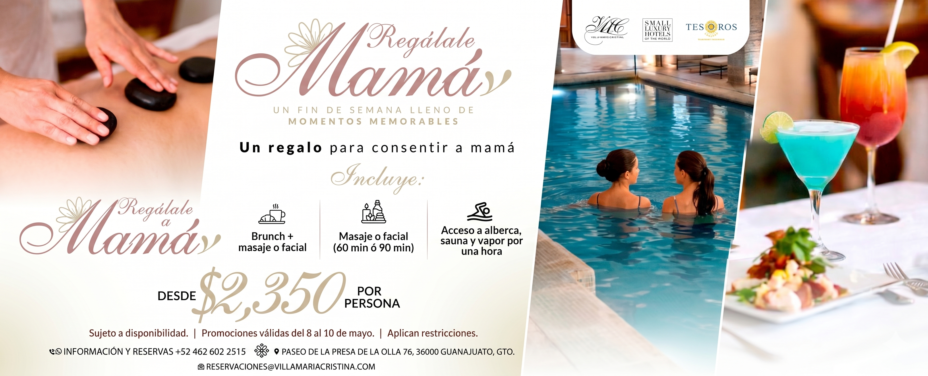 Sorpréndela con un fin de semana en Villa María Cristina. Nuestra oferta especial incluye una experiencia completa de relajación y gastronomía para que se sienta como una reina. Del 8 al 10 de mayo, disfruta de brunch, masaje y spa por un precio increíble. Reserva ahora.
